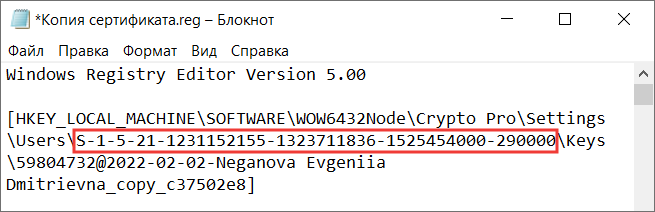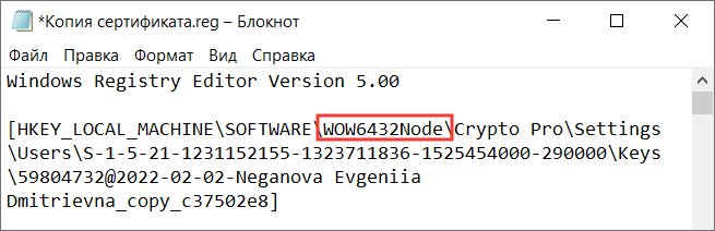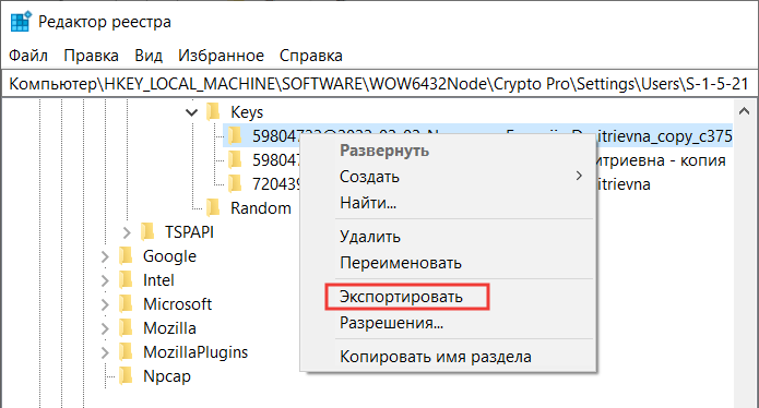 - для 64-битной ОС: HKEY_LOCAL_MACHINE\SOFTWARE\Wow6432Node\Crypto Pro\Settings\USERS\*идентификатор пользователя*\Keys\*Название контейнера*.