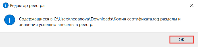 - Появится сообщение о том, что данные успешно внесены в реестр. Нажмите «ОК».