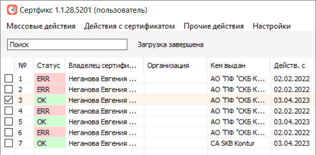 - Дождитесь загрузки всего списка контейнеров (сертификатов) и отметьте нужные.
