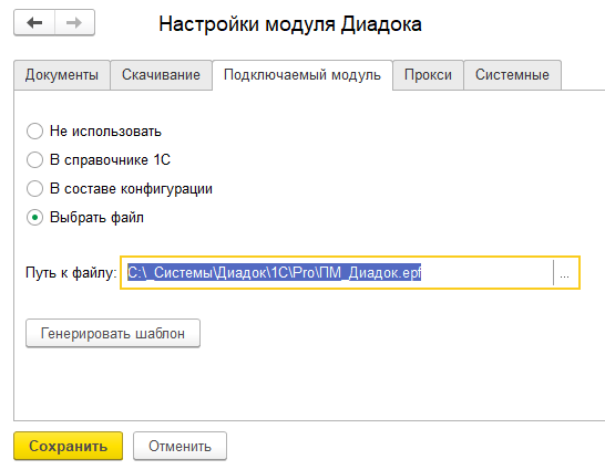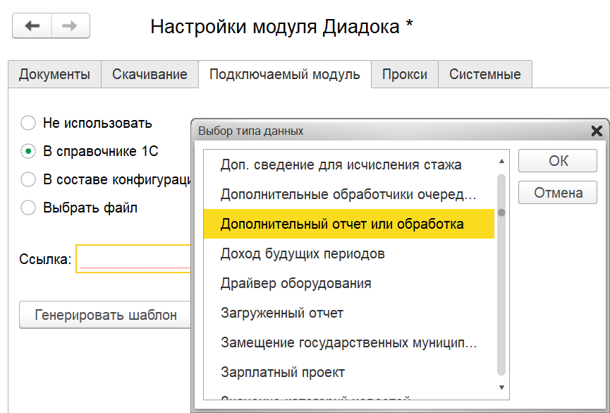Нажмите, чтобы раскрыть инструкцию, как добавить обработкуДобавьте в список дополнительных внешних обработок модуль Диадок. Для этого в зависимости от конфигурации 1С:
