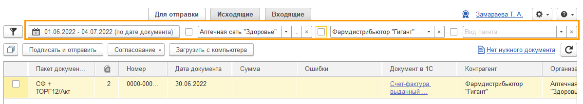 Для того чтобы документ появился в списке на отправку, проверьте параметры отображения по организации, контрагенту, дате, виду пакета документов.