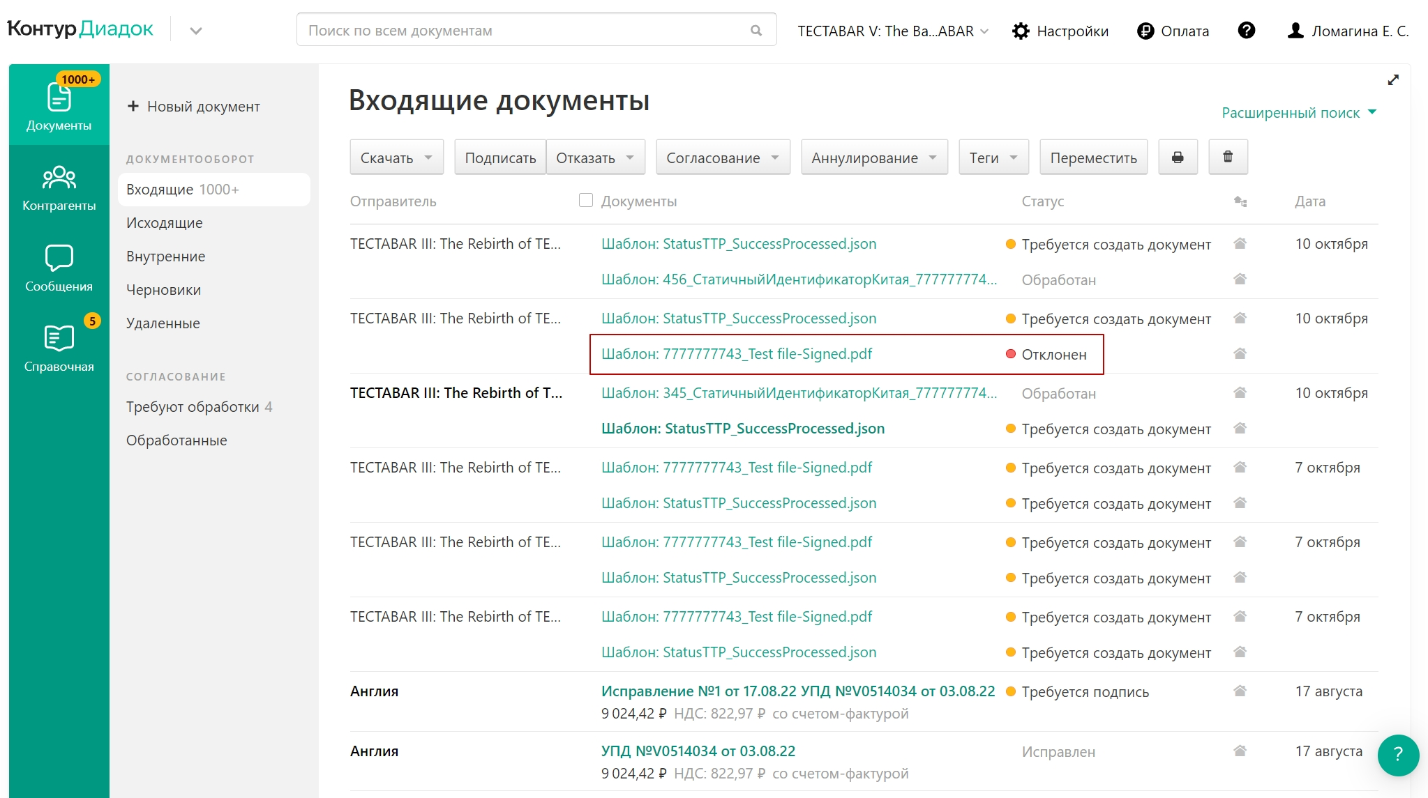 Если вы нажмете на кнопку «Отклонить», то из этого шаблона создать документ будет нельзя. Шаблон будет отклонен в Диадок и в списке документов поменяет свой статус на «Отклонен».