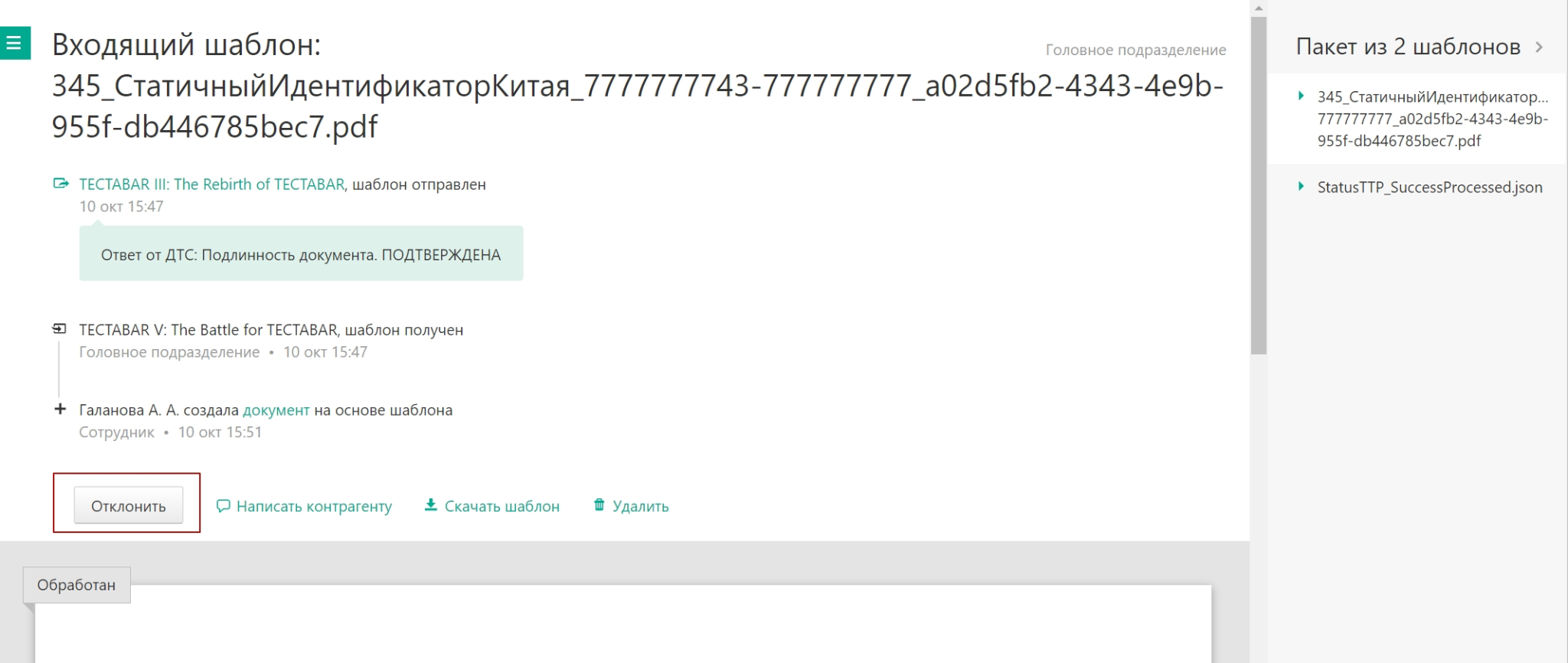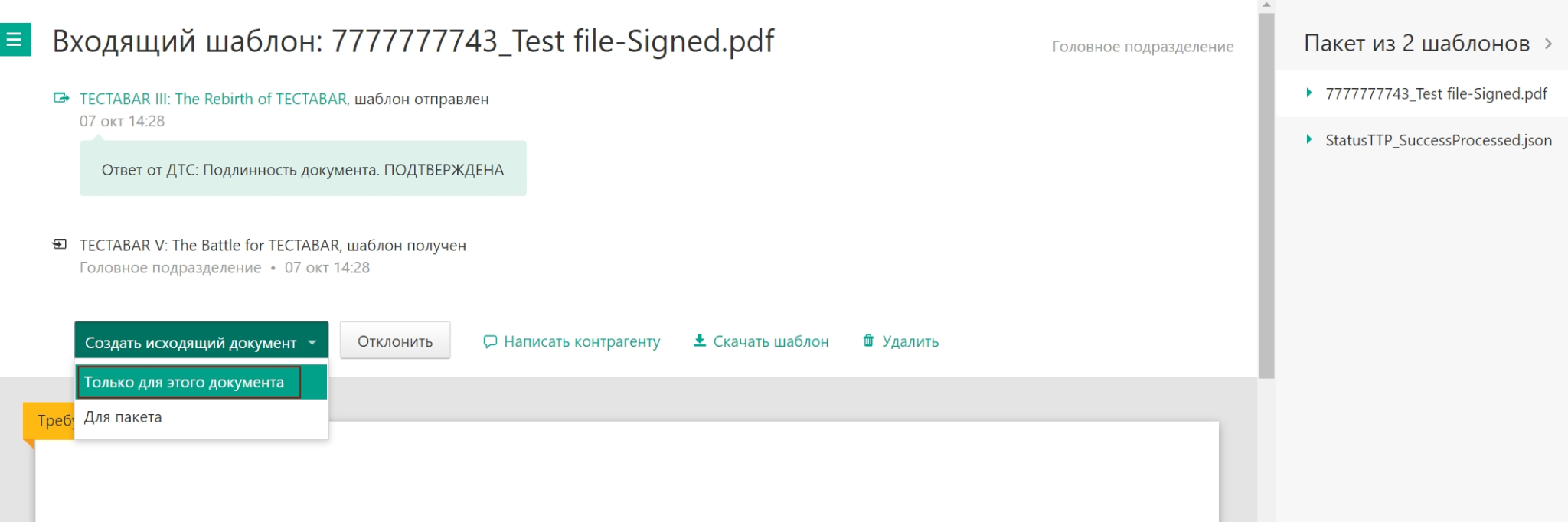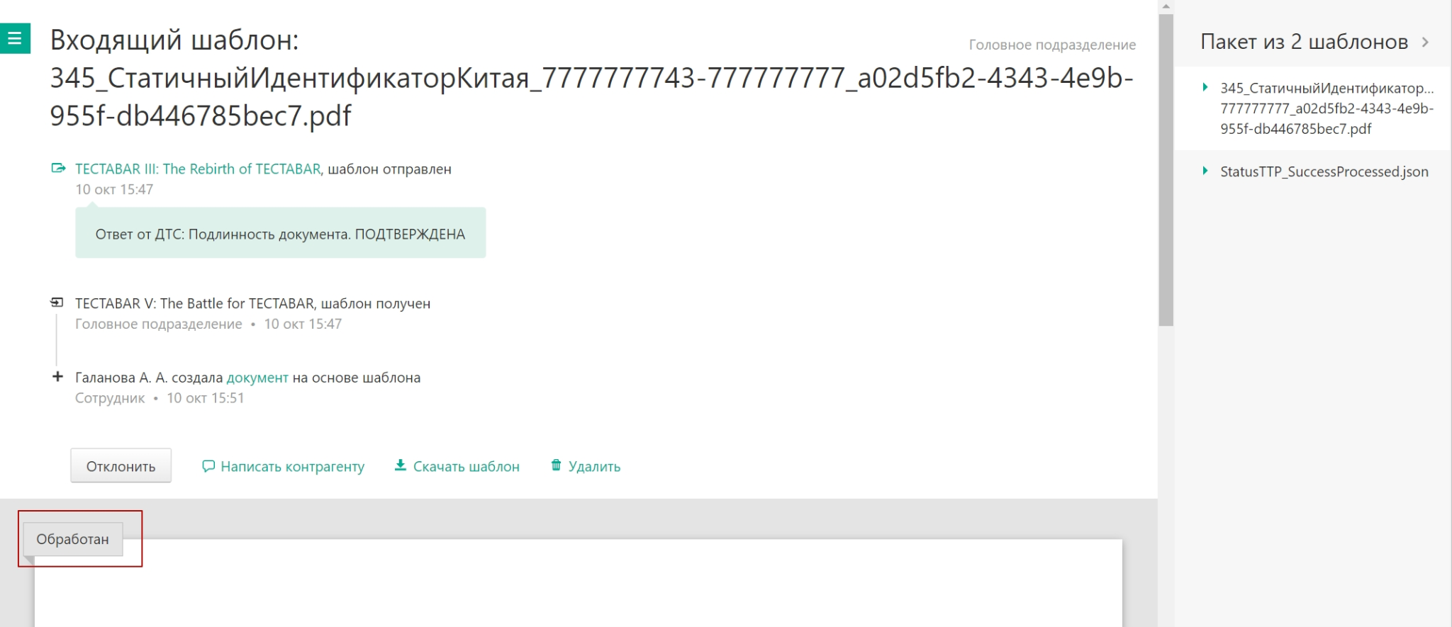 Создайте из шаблона документ. Для этого нажмите на кнопку «Создать исходящий документ» и выберите «Только для этого документа». Создавать документы для всего пакета не нужно, т.к. квитанцию от ДТС подписывать и отправлять контрагенту в Китай не требуется. После создания документа шаблон поменяет свой статус на «Обработан».