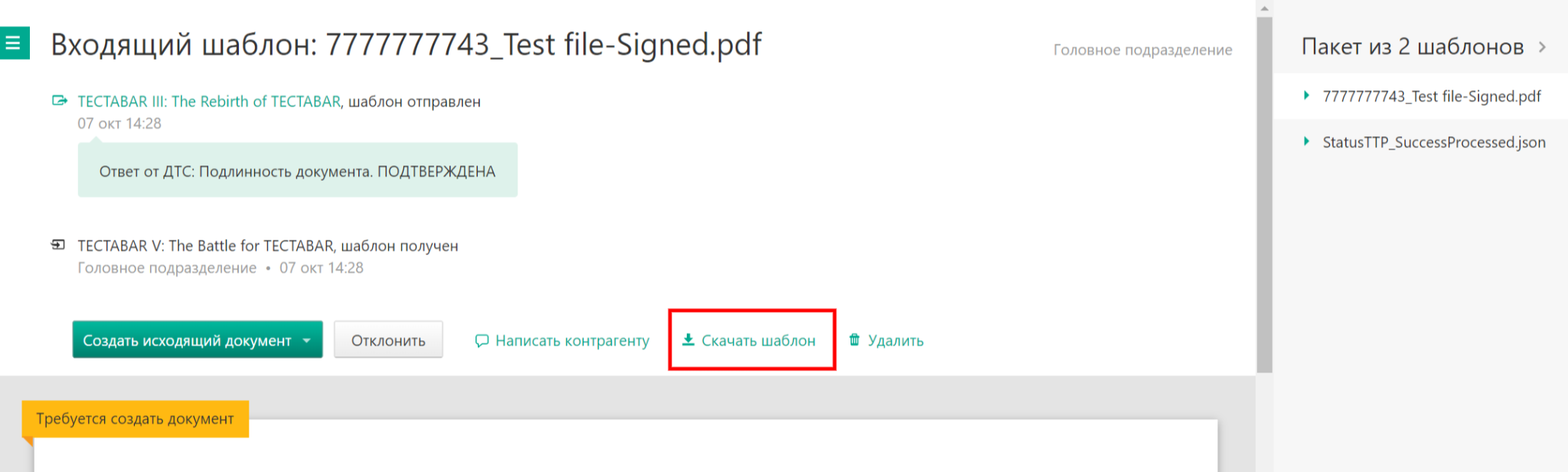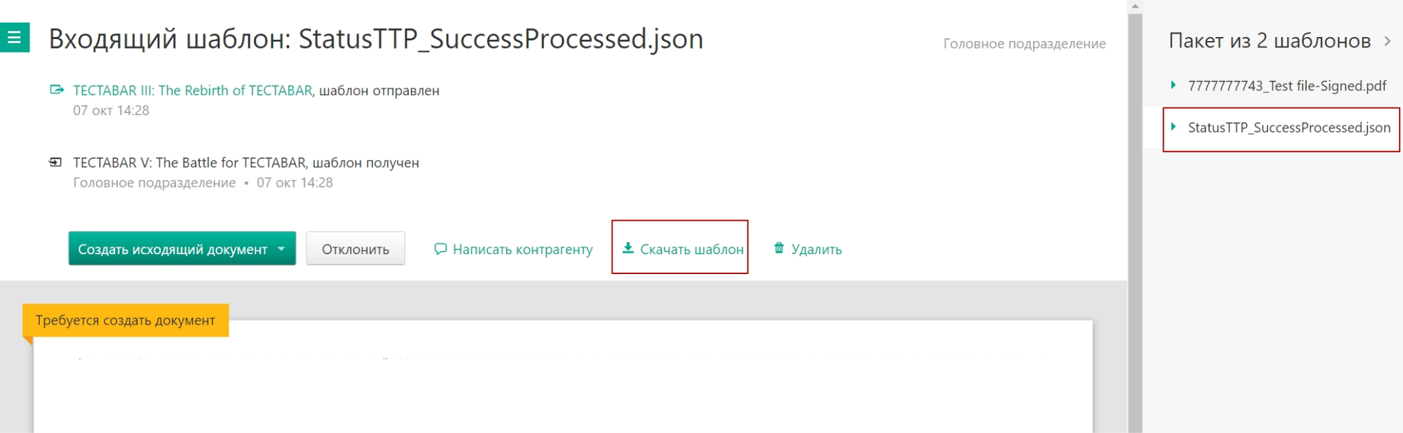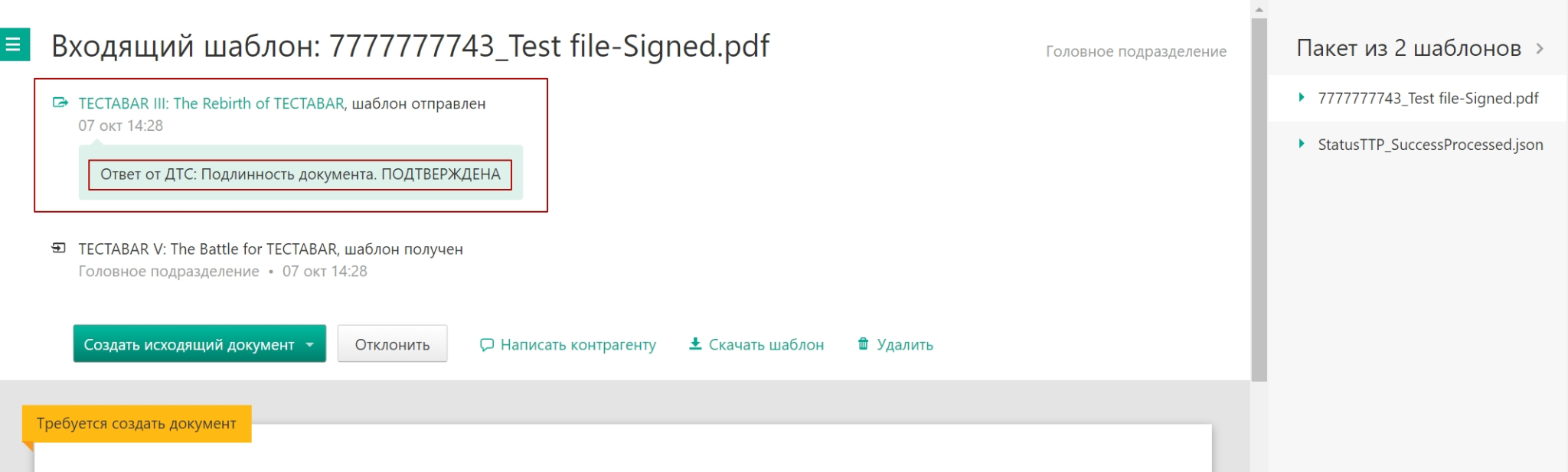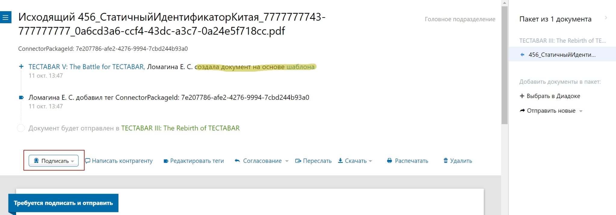 Создайте из шаблона документ. Для этого нажмите на кнопку «Создать исходящий документ» и выберите «Только для этого документа». Создавать документы для всего пакета не нужно, т.к. квитанцию от ДТС подписывать и отправлять контрагенту в Китай не требуется. После создания документа шаблон поменяет свой статус на «Обработан».
