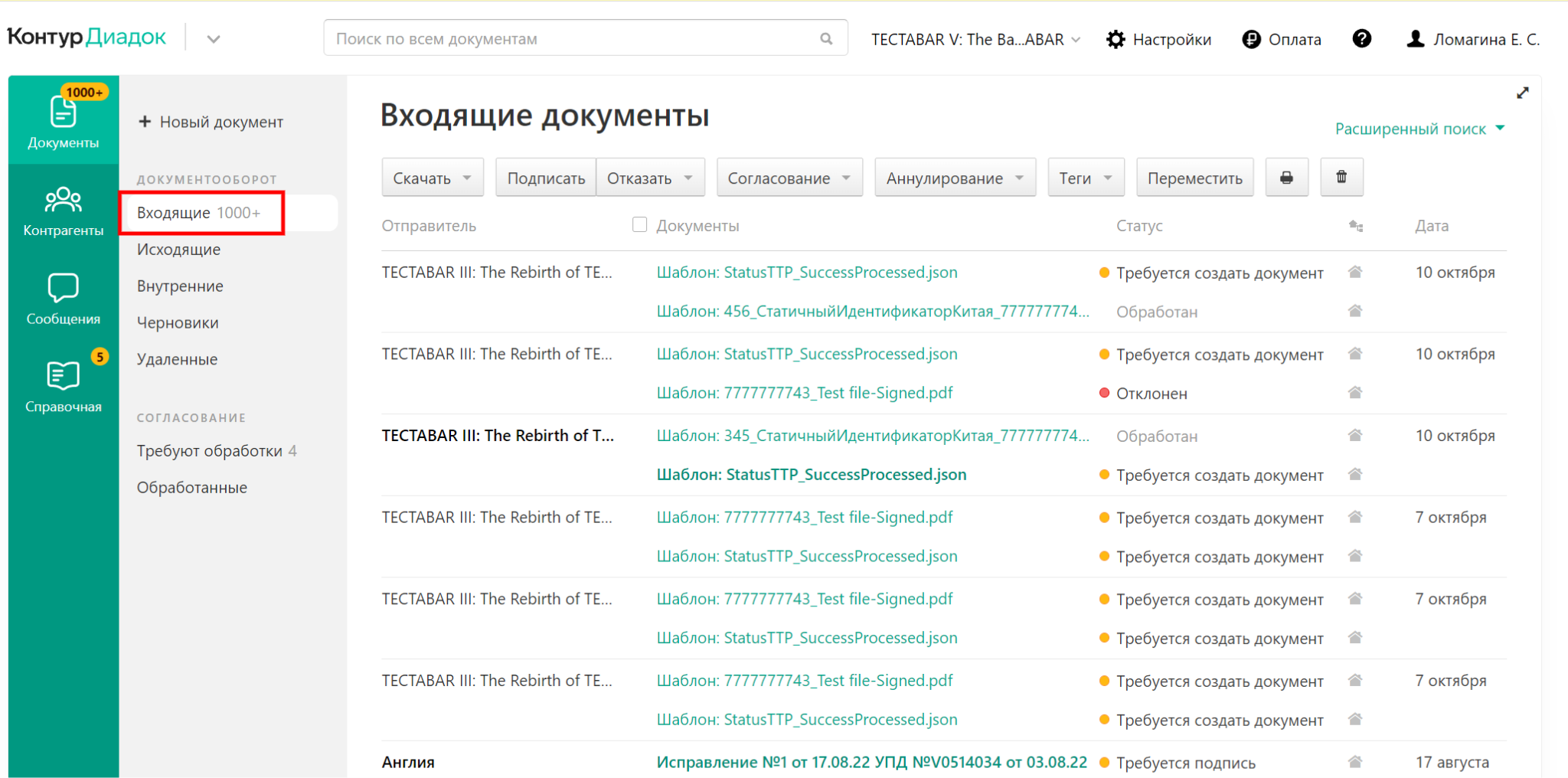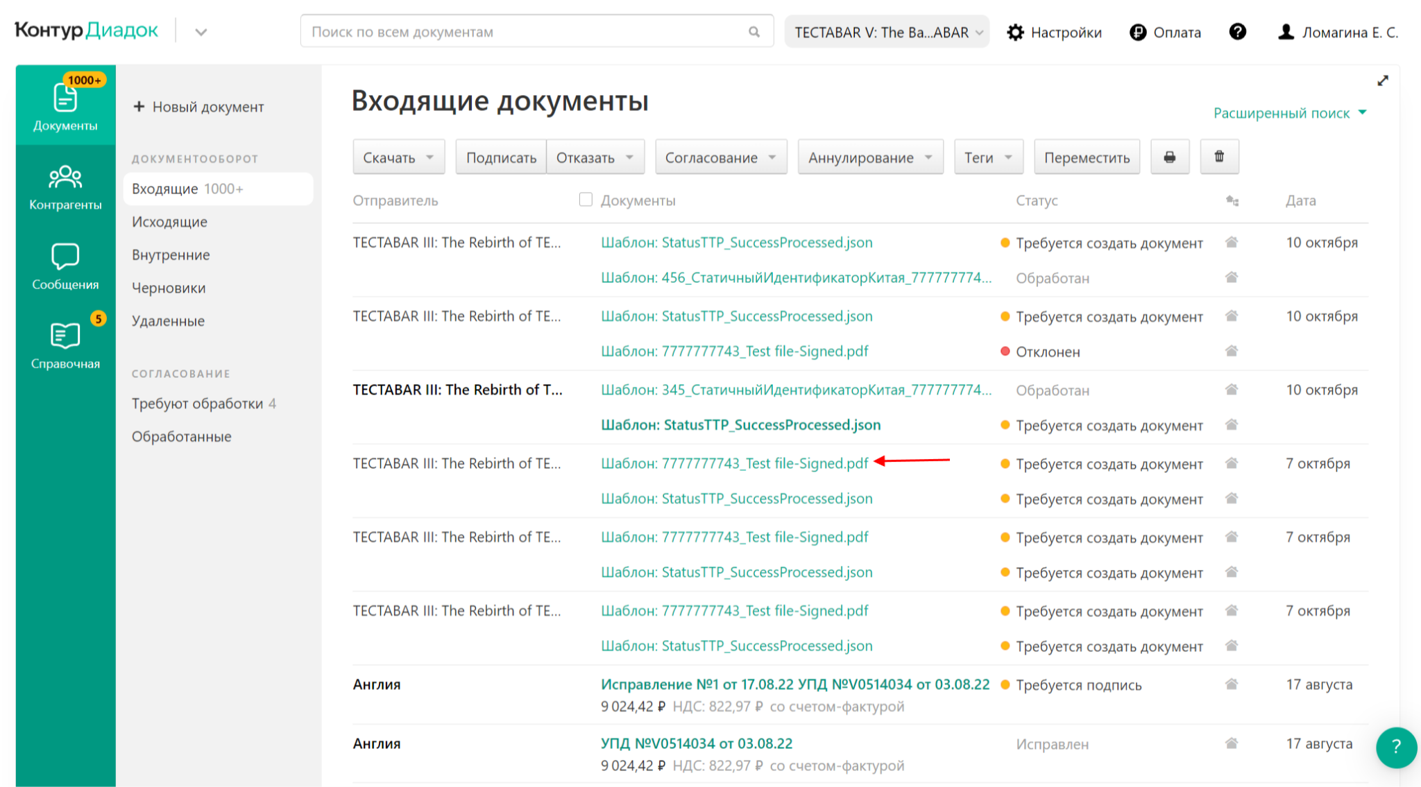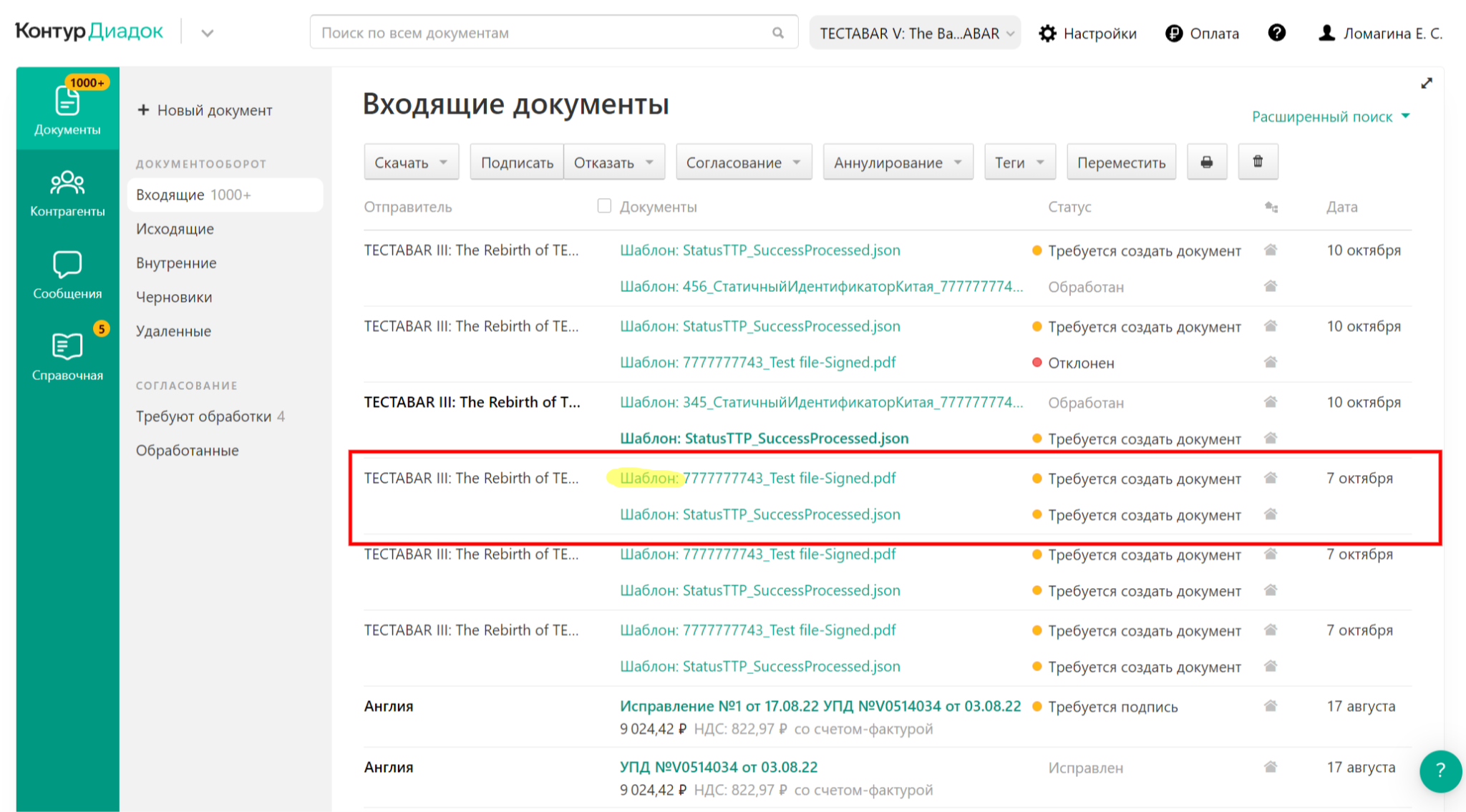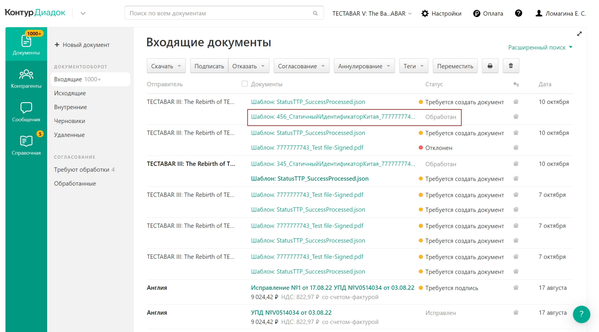 Все документы от Китая интеграционное решение Контура будет размещать в виде входящих шаблонов – в списке документов перед именем файла указано «Шаблон: …». Для более удобного поиска таких документов можно использовать фильтр по контрагенту.
