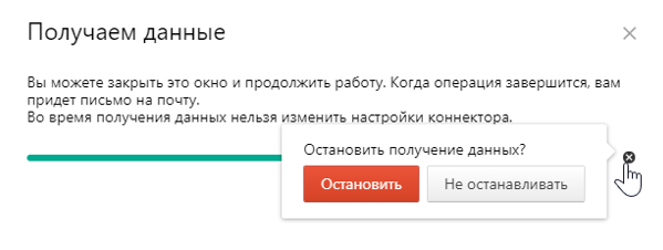 - Если данных много или указан большой период, их получение может занять длительное время. Окно с прогрессом можно закрыть — получение данных не прервется. Когда работа завершится, на указанную электронную почту отправится письмо. Отслеживать прогресс получения данных можно также со страницы настроек.