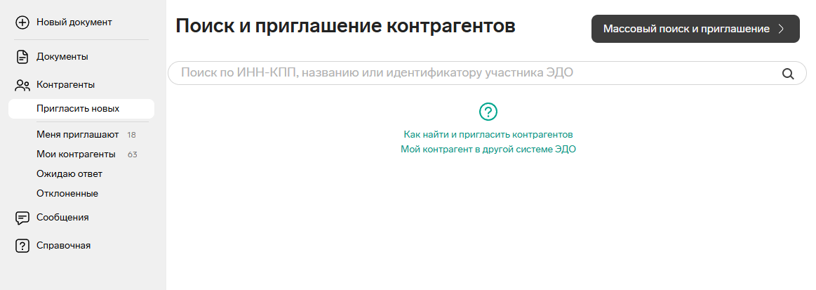 - Найти контрагента по названию, ИНН или идентификатору участника ЭДО.