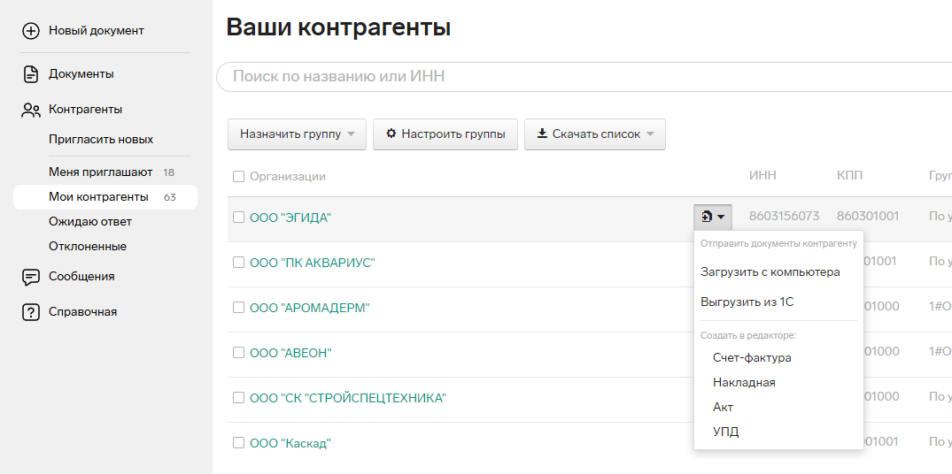 Здесь же можно отправить документы контрагенту. Для этого наведите курсор на строку с организацией, нажмите на появившуюся кнопку и выберите нужное действие. Подробнее см. Как создать и отправить документ.