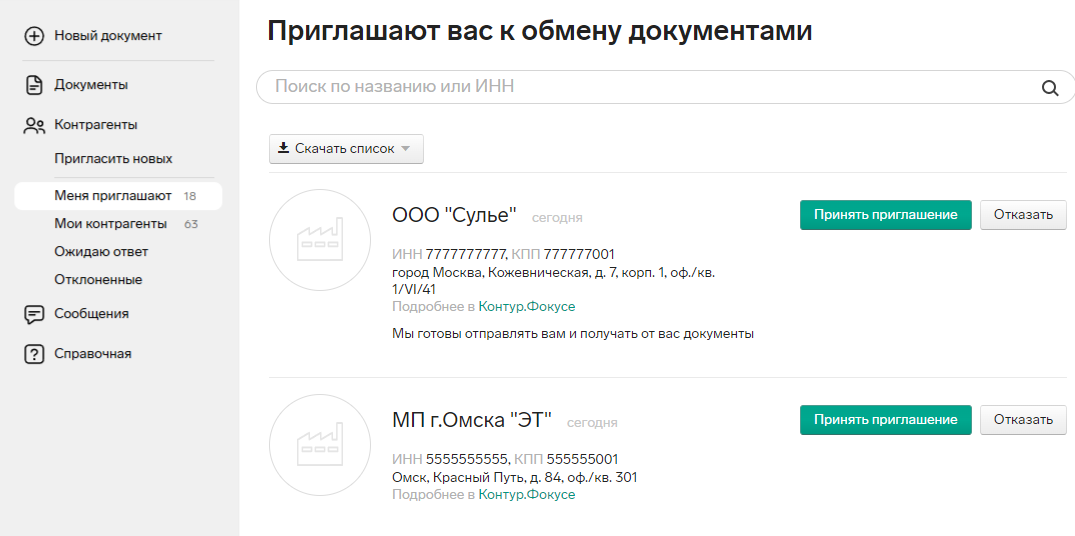 Раздел содержит список приглашений на обмен документами от других организаций. Чтобы скачать список контрагентов, нажмите на кнопку «Скачать список».