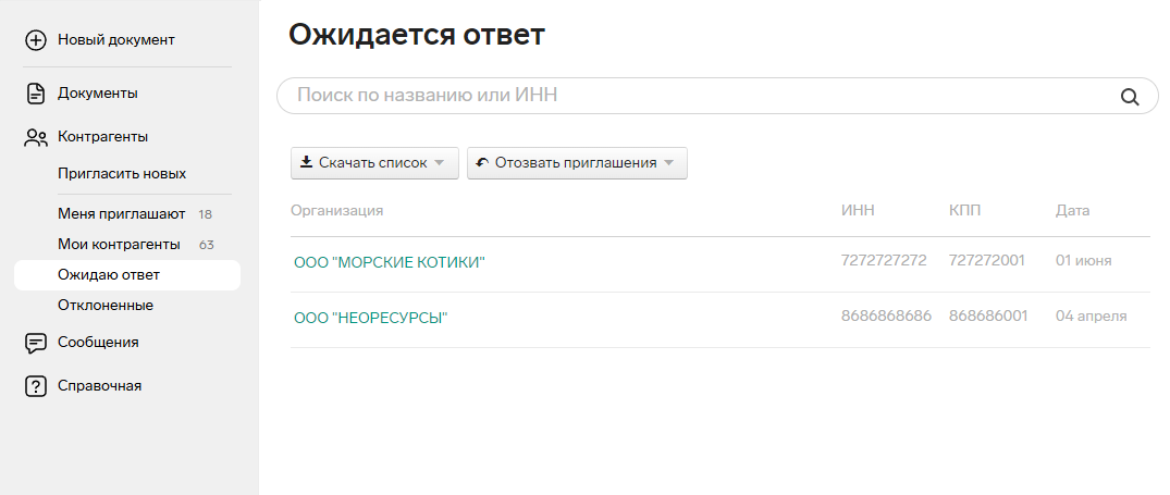 После того как организация примет приглашение, она будет перенесена в раздел «Мои контрагенты».