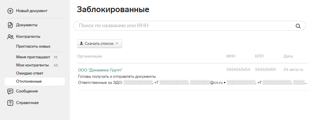 Раздел содержит список организаций, которым был отправлен отказ на приглашение или которые сами отказали вам в приглашении, а также были удалены из списка контрагентов. Чтобы скачать список контрагентов, нажмите на кнопку «Скачать список».
