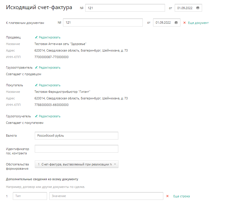 - «Покупатель». Указываются реквизиты покупателя. Проставляются автоматически, если было заполнено поле «Получатель» на странице отправки документов (см. статью Формирование и отправка счета-фактуры). Если получатель не указан, заполните его реквизиты с помощью ссылки «Заполнить». При необходимости возможно изменить реквизиты. Для этого нажмите на ссылку «Редактировать» и укажите нужные данные.