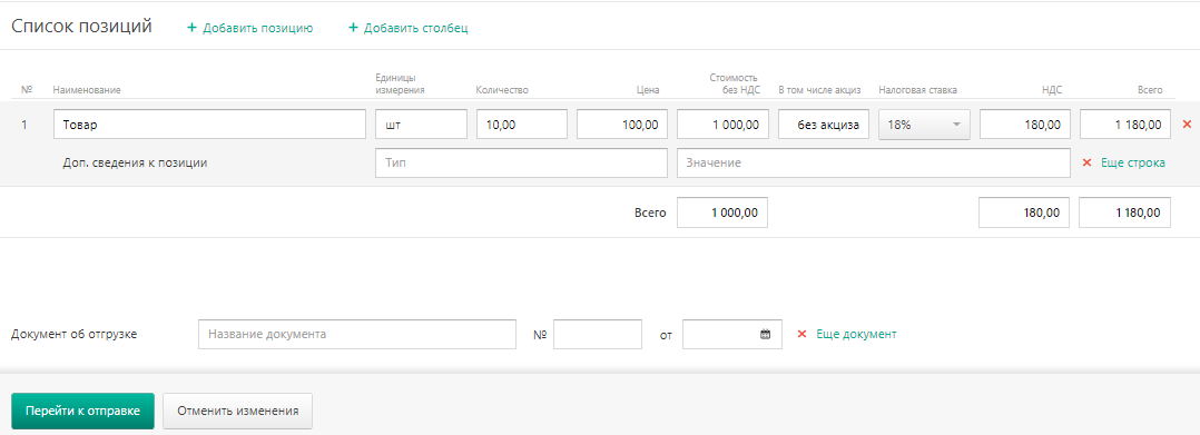 Чтобы добавить новую строку, нажмите на ссылку «+ Добавить позицию».