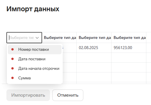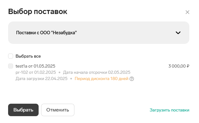 - Выберите поставки из предложенного списка или загрузите другие поставки в список.