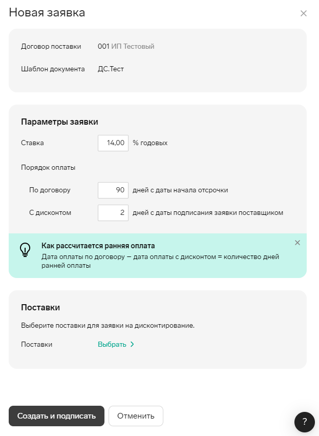 - Выберите поставки для заявки, нажав ссылку «Выбрать».