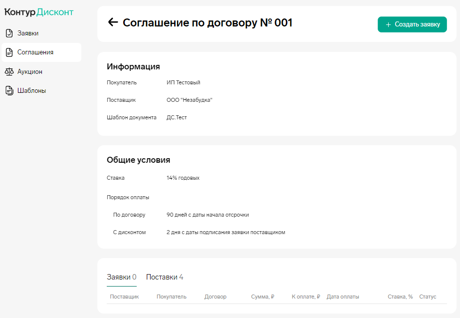 Новая заявка появляется в разделе «Заявки» со статусом «Ожидает подписи».