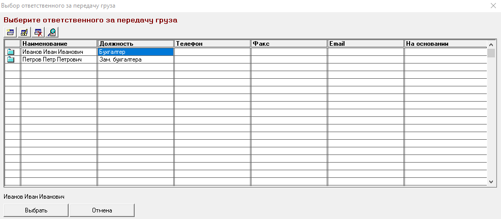 - В дополнительных реквизитах укажите ответственного за передачу груза. Для этого двойным нажатием на поле «Значение реквизита» откройте список сотрудников, ответственных за передачу груза.