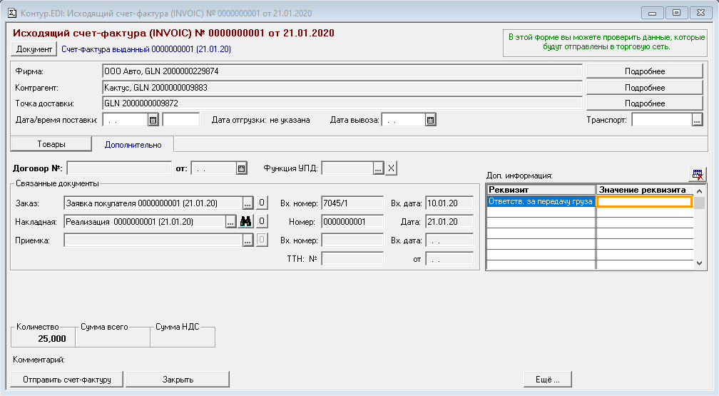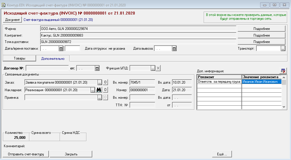 При отправке сообщения INVOIC в ТС Линия необходимо указать ФИО и должность ответственного за передачу груза. Для этого: