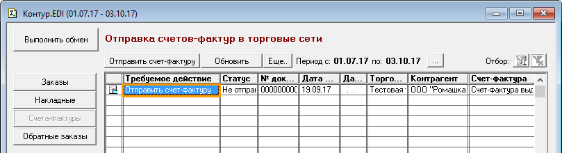 - Перейдите на вкладку «Счета-фактуры». Счет-фактура появится в списке сообщений с требуемым действием «Отправить счет-фактуру». Откройте карточку исходящего сообщения.