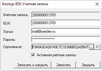 Поле «Учетная запись» заполнится значением GLN. - Установите флажок «Активная учетная запись» и нажмите «Записать и закрыть».