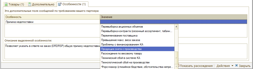 Причина недопоставки указывается в сообщениях ORDRSP или DESADV. Для этого: