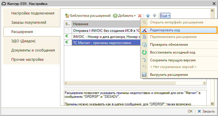 - На вкладке «Расширения» выберите расширение «ТС Магнит — причина недопоставки» и нажмите «Еще» → «Редактировать код».