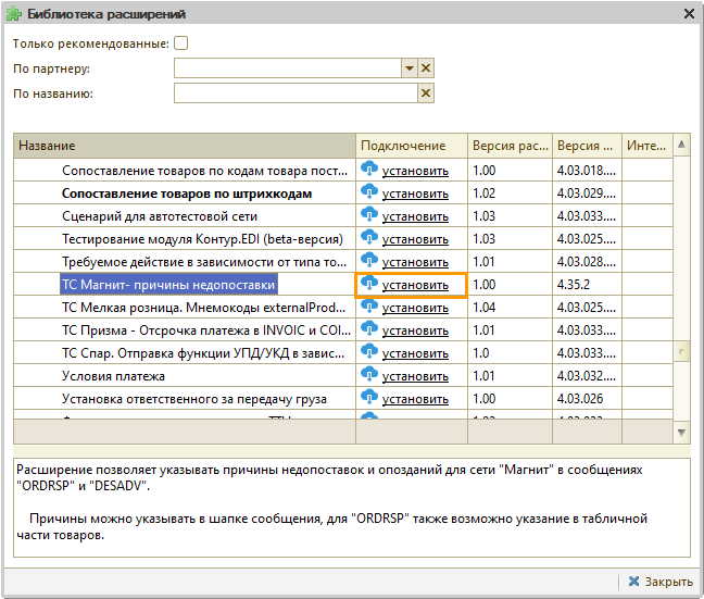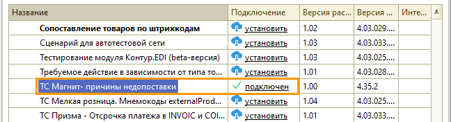 - Найдите расширение «ТС Магнит — причина недопоставки» и нажмите «Установить».