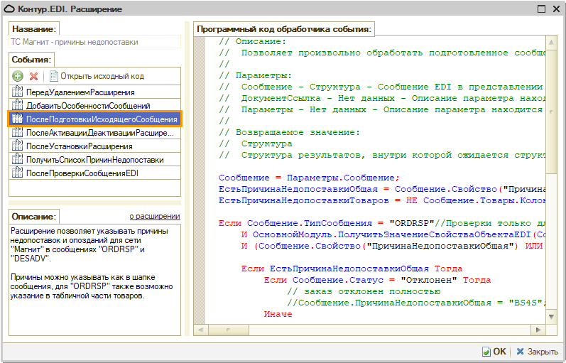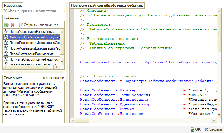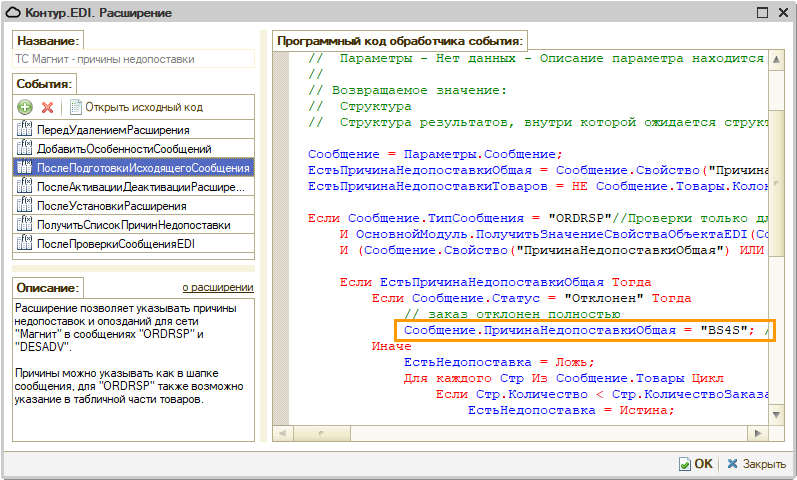 В поле «Программный код обработчика событий» код поменяется. - Раскомментируйте код (в строках удалите «//») и допишите нужные причины недопоставки.
