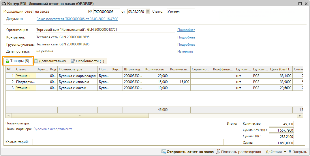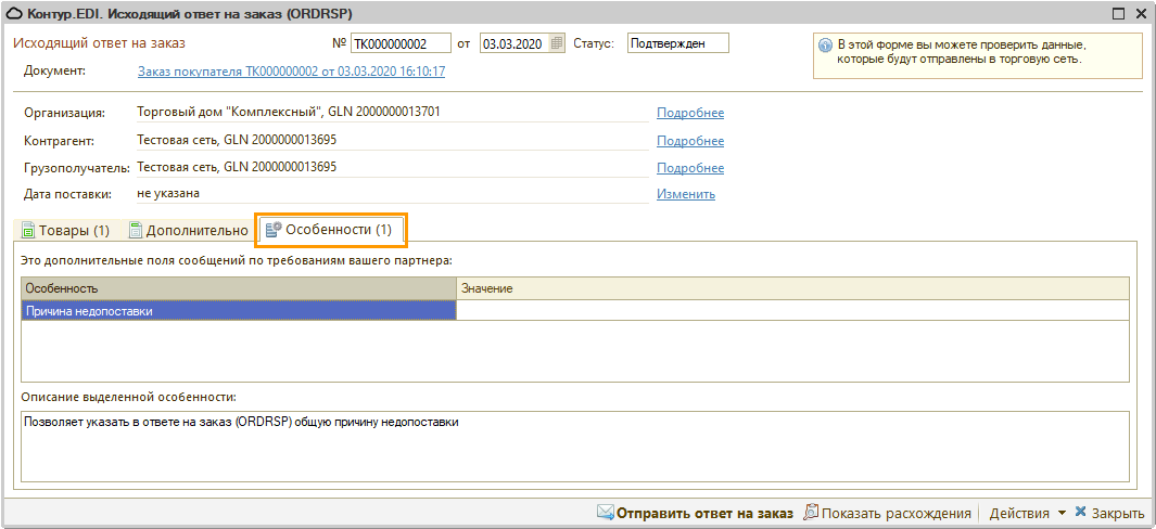 1) В карточке сообщения ORDRSP или DESADV перейдите на вкладку «Особенности». - В табличной части для конкретного товара. Заполняется только в сообщении ORDRSP.