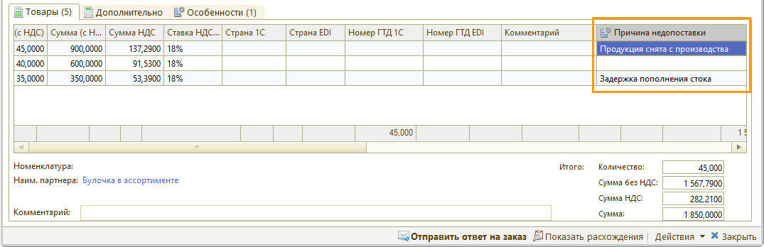 Причина недопоставки — информация о конкретной причине, вызвавшей нарушение срока поставки, разницу между заказанным и подтвержденным количеством.