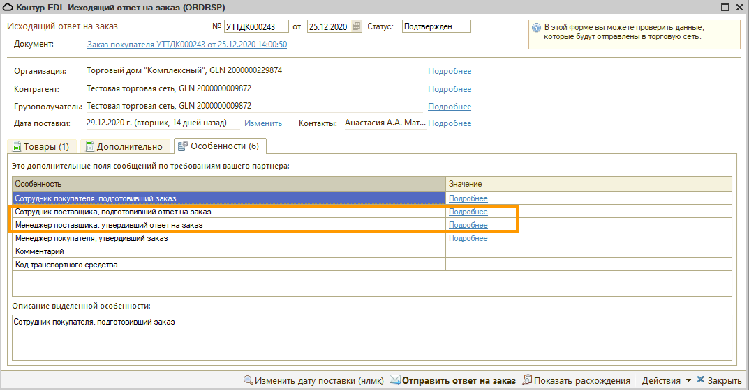 В сообщении ORDRSP на вкладке «Особенности» укажите: