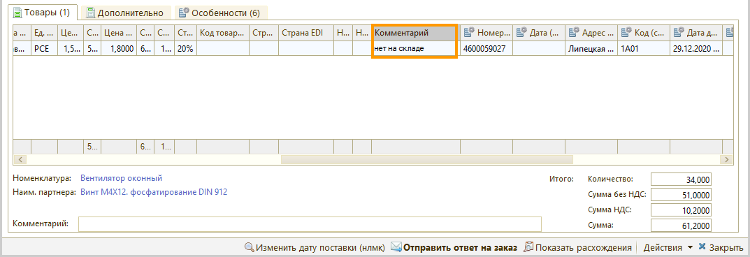 - Если изменено количество товара по заказу — необходимо указать в поле «Комментарий» причину недопоставки.