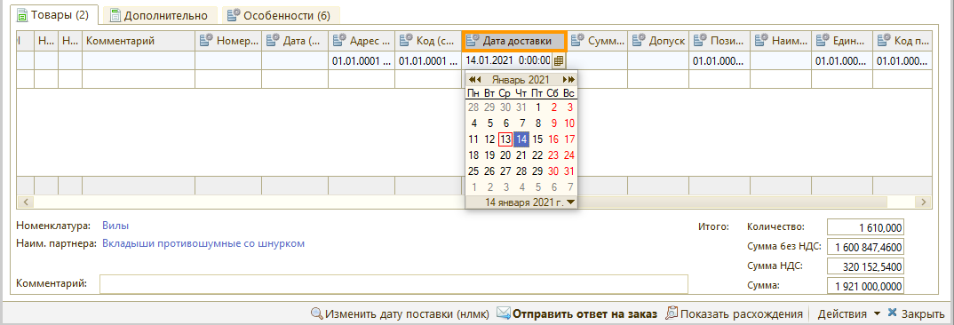 - Если необходимо изменить дату поставки по одной позиции — измените дату поставки позиции на форме сообщения.