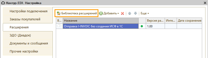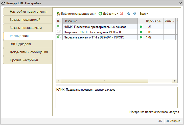 - В открывшемся окне выберите расширения «НЛМК. Поддержка предварительных заказов» и «Передача данных о ТТН в DESADV и INVOIC». Нажмите «установить».