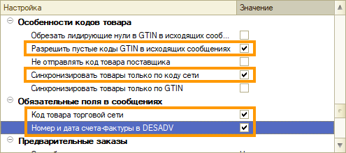 - Разрешить пустые коды GTIN в исходящих сообщениях