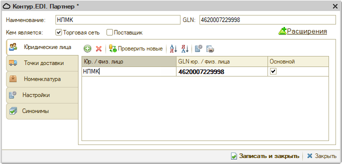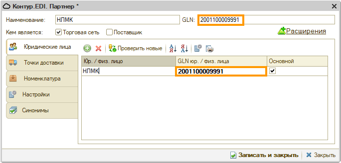 По завершению тестирования с сетью НЛМК в карточке торговой сети измените основной GLN сети и GLN юридического лица на 4620007229998. Для сохранения настройки нажмите «Записать и закрыть».