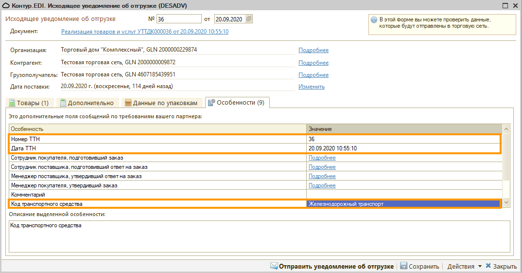 В сообщении DESADV на вкладке «Особенности» укажите: