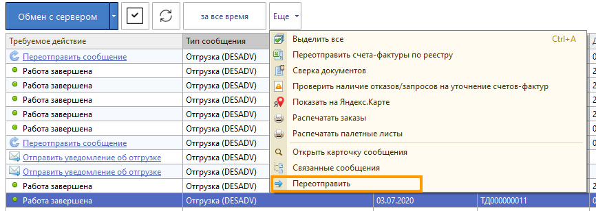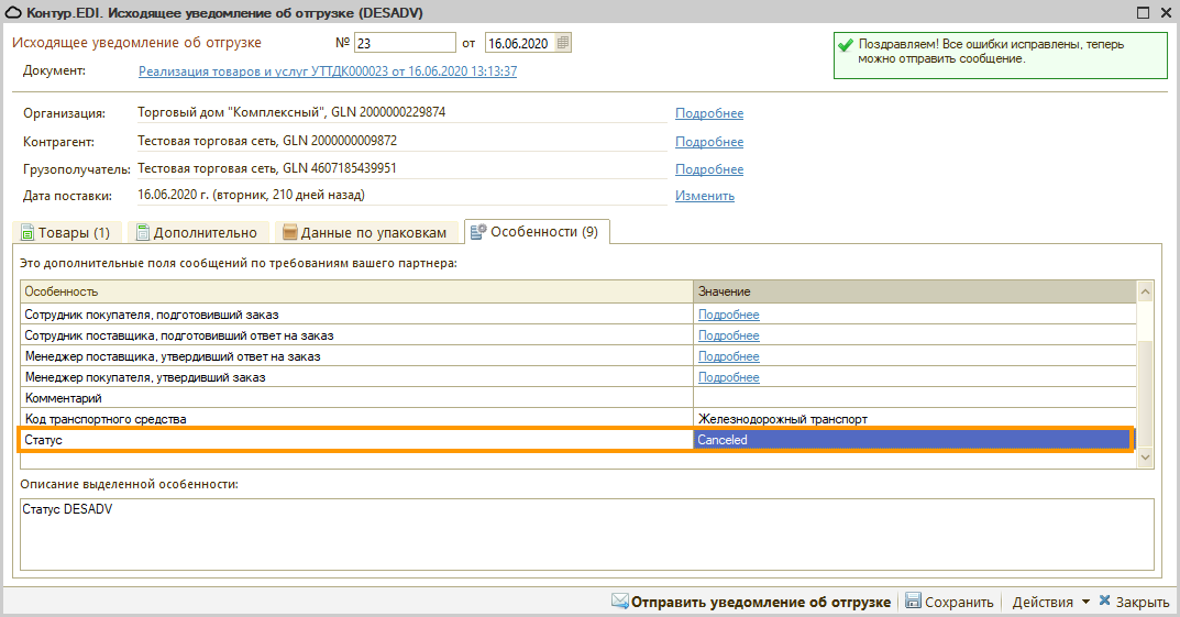 - Переотправьте сообщение еще раз, предварительно исправив нужные данные в документе 1С или в окне сообщения DESADV. При полной отмене поставки данный пункт выполнять не требуется.