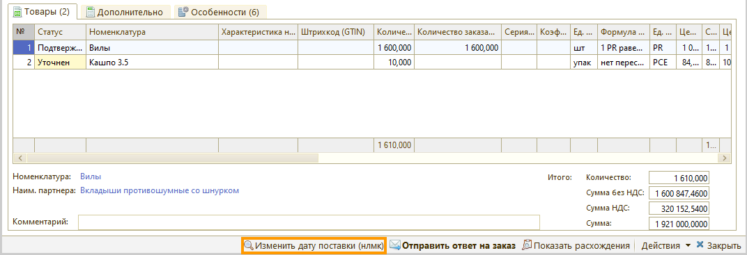 - Если необходимо изменить дату поставки по всем позициям — нажмите кнопку «Изменить дату поставки» на форме сообщения.