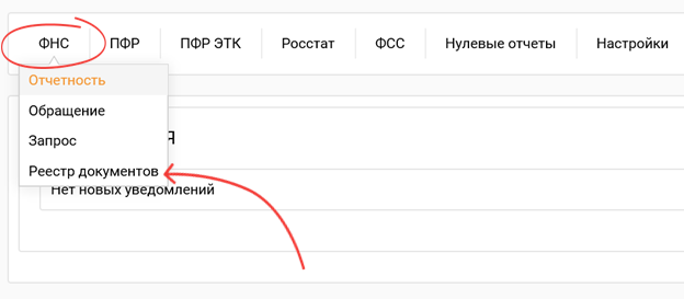 - Перейдите в раздел необходимого контролирующего органа → «Реестр документов».
