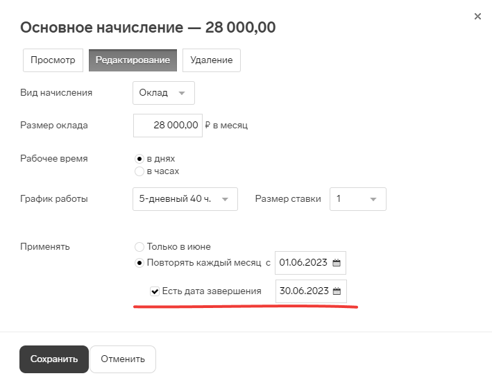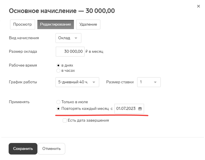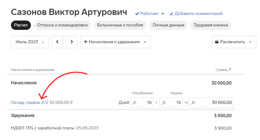 Если нужно изменить начисление (например, изменить размер оклада), воспользуйтесь инструкциями выше: «Как изменить график и оклад, начиная с текущего месяца» и «Как изменить график и оклад, начиная с прошлых месяцев».