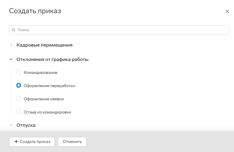 - В открывшемся окне выберите «Отклонения от графика работы» → «Оформление переработки».