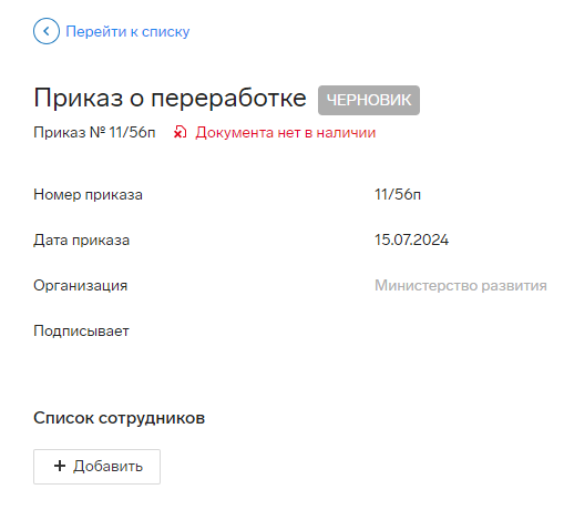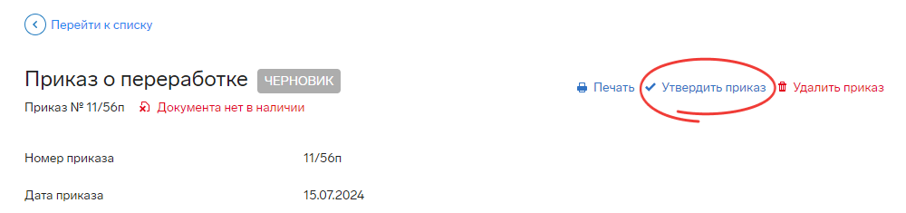 Приказ перейдет в статус «Утвержден». Данные будут разнесены в «Личное дело» → «Трудовой договор» → «Переработки» и отражены в «Табеле».