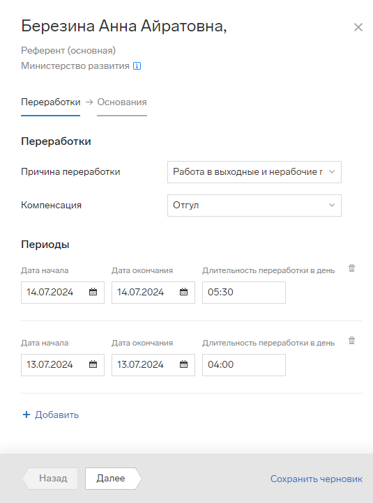 В периодах заполните даты начала и конца переработки, ее длительность. Нажмите «+ Добавить», чтобы добавить еще один период.