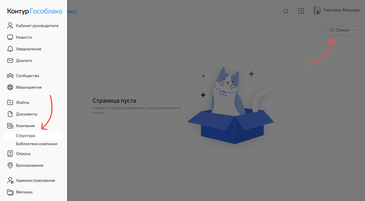 Для перехода к схеме откройте раздел «Компания» → «Структура» и в верхнем правом углу в раскрывающемся меню выберите «Схема».