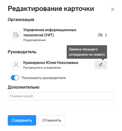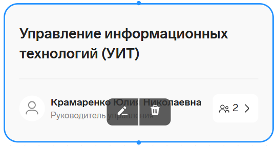 Для редактирования карточки наведите на нее курсор мыши и нажмите значок . Здесь можно скрыть руководителя подразделения или выбрать вместо него другого сотрудника. Это полезно, например, если руководителя временно замещает кто-то другой.