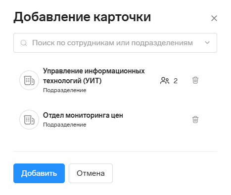 В карточке подразделения будет наименование, руководитель (если он есть) и количество сотрудников.