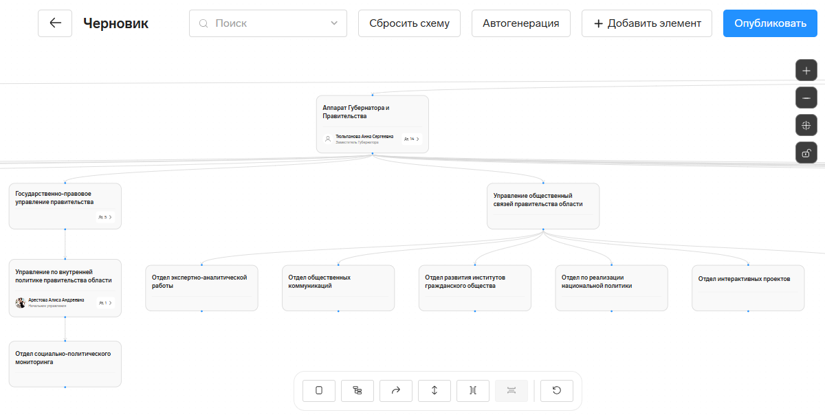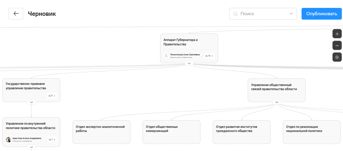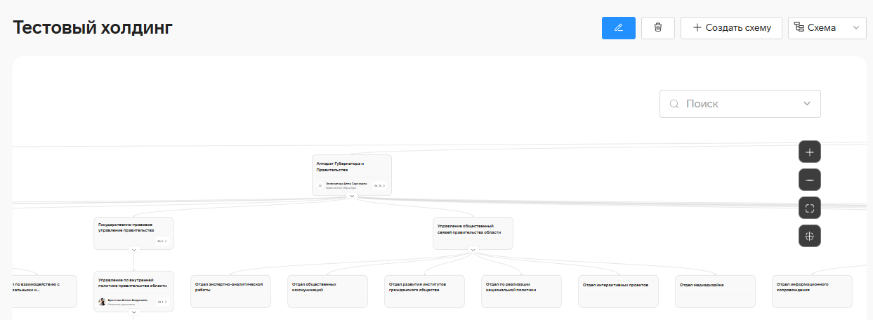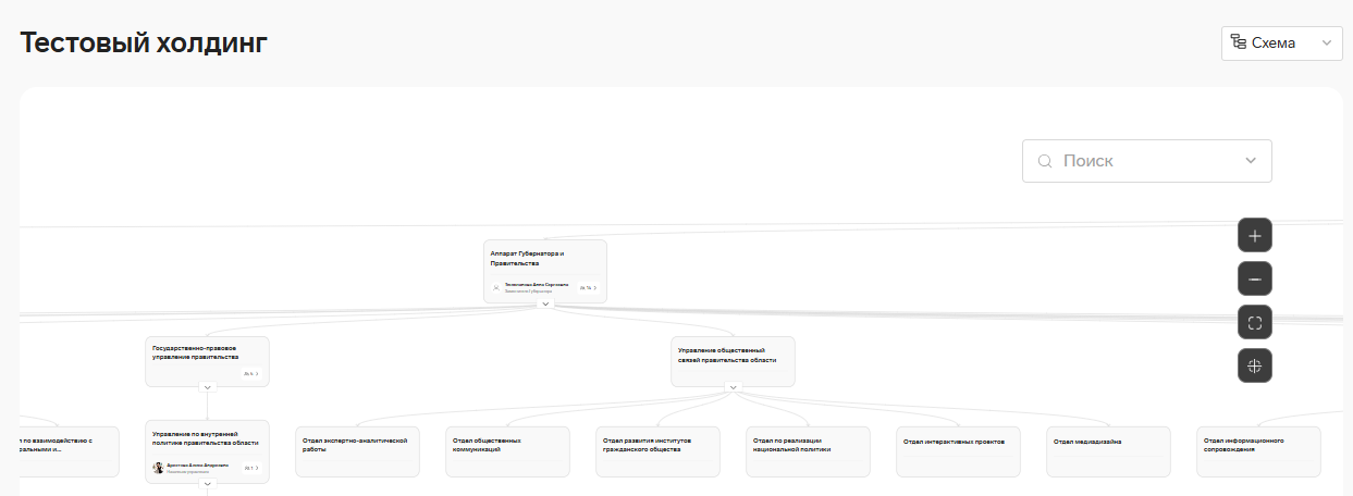 Поиск по опубликованной схеме доступен для всех пользователей. Поиск работает работает как по ФИО сотрудника (для карточек сотрудника), так и по наименованию подразделения (для карточек подразделений).