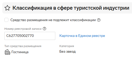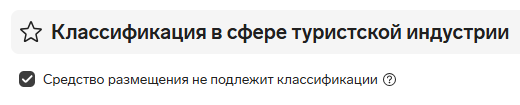 Объекты, не подлежащие классификации, перечислены в части 29 статьи 5.1. № 132-ФЗ «Об основах туристской деятельности в Российской Федерации». Если ваш объект относится к таким, отметьте в настройках «Средство размещения не подлежит классификации».