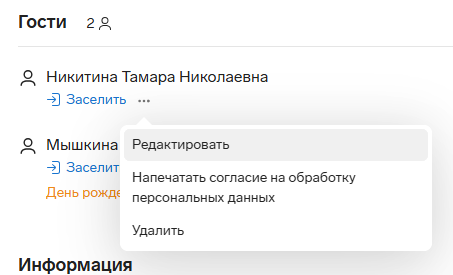 Данные гостя можно изменить. Как сервис работает с изменениями:- Если гостя выбрали из предложенного списка, а затем поменяли тип документа, серию или номер, сервис создаст нового гостя как полного тезку. Например, в списке выбрали Мышкина Сергея Петровича. Затем у него поменяли номер и серию паспорта. Сведения сохранили. В сервисе будет два Мышкина Сергея Петровича с разными паспортными данными.